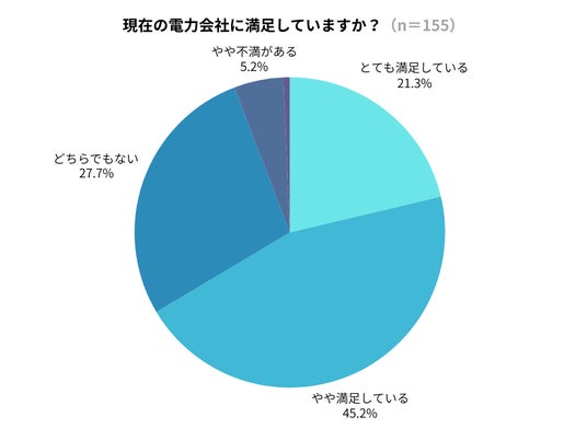 現在の電力会社への満足度については、「とても満足している」と「やや満足している」を合わせて103人(66.5%)が満足していると回答しました。不満を持つ人はわずか9人(5.8%)にとどまっており、全体的に高い満足度を示しています。