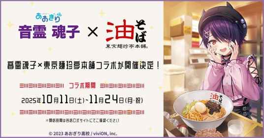 株式会社ムービックは、VTuberグループ『あおぎり高校』の所属メンバー「音霊魂子」と元祖油そば専門店「東京麺珍亭本舗」とのコラボ施策を、2025年10月11日~11月24日まで開催いたします。