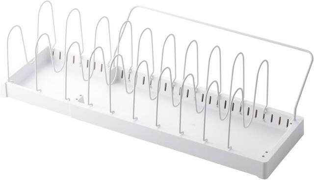 最大9枚までフライパンや鍋ふたを収納でき、直径約30cmまでの対応。引き出しの開閉時にもズレることなく、安定した使用感を保ってくれます。さらに、フライパン専用の取っ手スタンドも付いているので、取り出しやすさも片付けやすさもハイレベル。