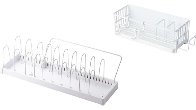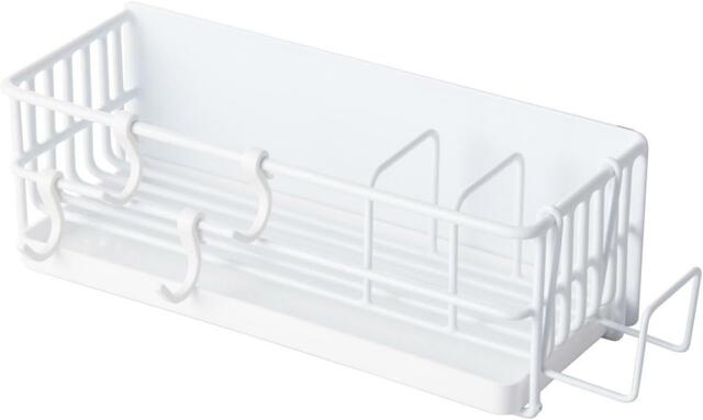 スライド式の水受けトレーも片手でスムーズに取り外し可能。掃除の手間を大幅に軽減してくれます。付属のフックを使えは、たわしなどの小物もスッキリ整理できます。