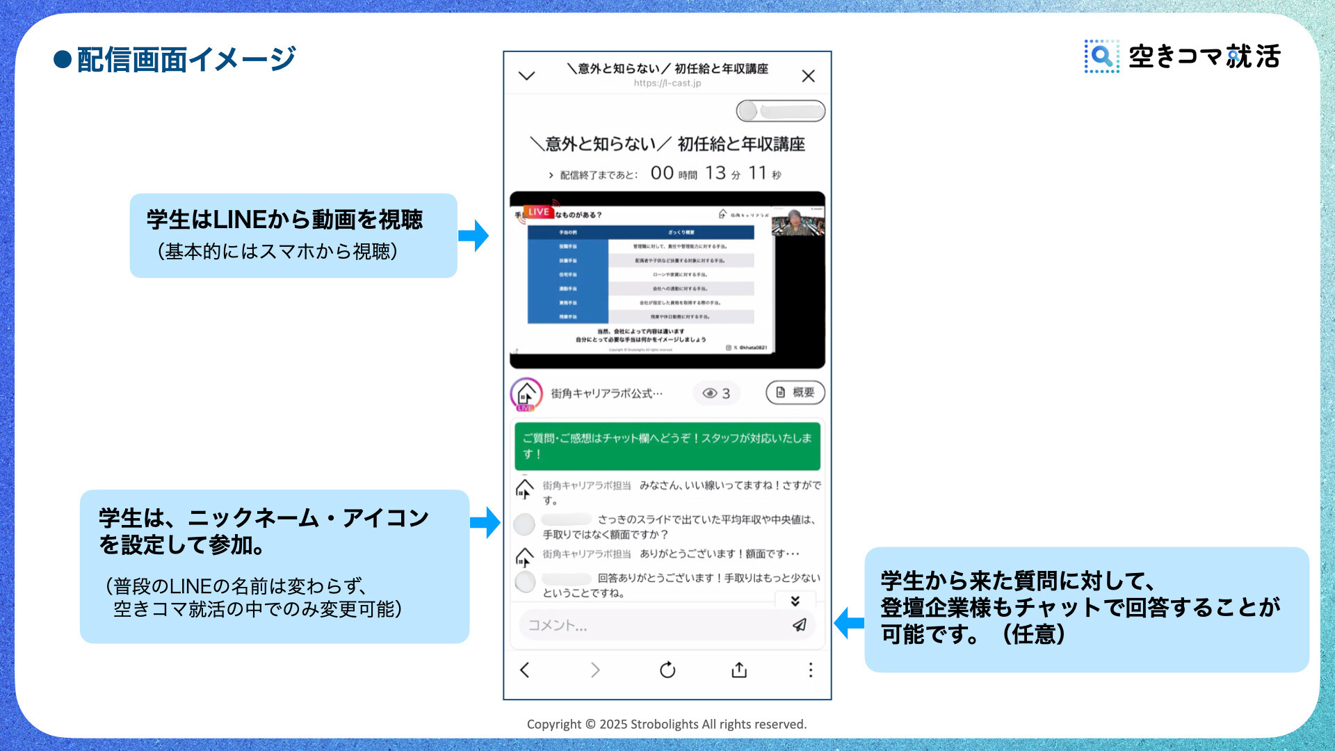株式会社Strobolights(本社:東京都町田市、代表取締役社長:羽田啓一郎、以下Strobolights)では学生の授業の合間やアルバイト・部活動の隙間時間=「空きコマ」を活用し、企業説明会の視聴を可能にする新しい動画配信サービス「空きコマ就活」を2025年10月31日(金)より提供開始します。