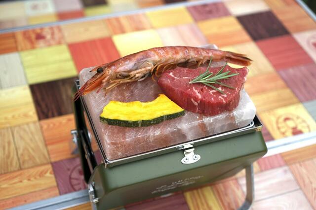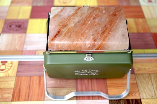 早速、「岩塩プレート」と「モンテ V型卓上グリル B6型 (オリーブ)」をバーベキューで使ってみました。