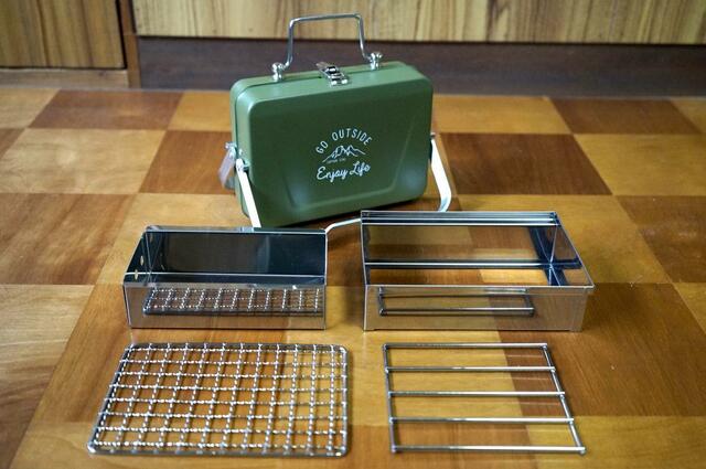 「モンテ V型卓上グリル B6型 (オリーブ)」は、折りたたみ式のポータブルバーベキューコンロで、1〜2人用にちょうどいいコンパクトサイズ。目皿フレームと目皿(燃焼用)、バーベキュー網、ゴトクがセットになっています。