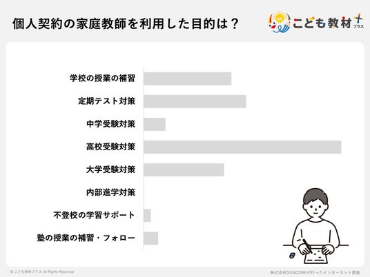個人契約の家庭教師を利用した目的を調査したところ、最も多かったのは「高校受験対策」で、全体の約4割(27名)を占めました。子どもの将来を左右する重要な局面で、個人契約という選択がされている実態がわかります。