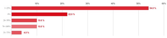 まとまったお金を「運用に回した割合」について、「1~25%」と回答した人が54%と半数を超え圧倒的に多かった。