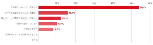 「元本割れしないこと(安全性)」が54.0%で圧倒的に多く、次ぐ「いつでも現金化できること(流動性)」は16.0%だった。