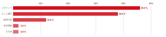 「メガバンク」が46.0%と半数近くとなり最も多く、次いで「ネット銀行」(38.0%)が2番目に多かった。