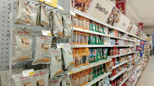 東アフリカでも事業を展開するフランスの大手スーパーマーケット「カルフール」の店内(ウガンダ)。「Out of Africa」のパッケージが存在感を放つナッツ売り場