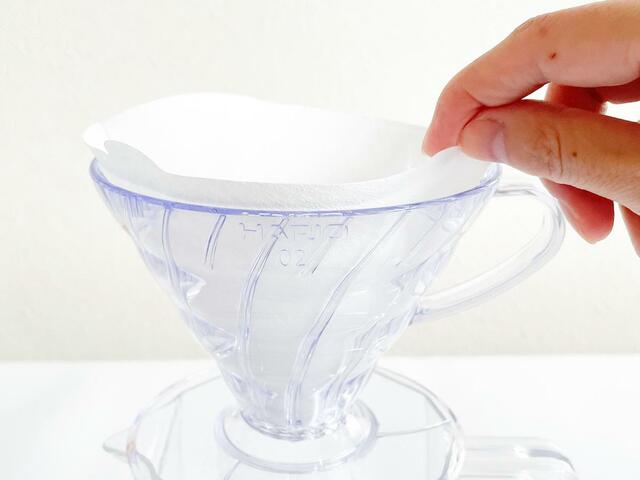 コーヒーを淹れるためには、まずドリッパーにペーパーフィルターをセットします。