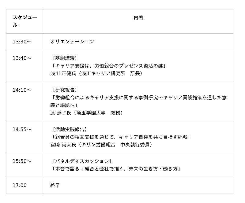 登壇者には、日本におけるキャリア支援の草分け的存在として活躍されてきた浅川 正健氏(浅川キャリア研究所 所長)、大学研究者や現役の組合役員を招き、組合主導でのキャリア支援実践について学び合う1日となります。