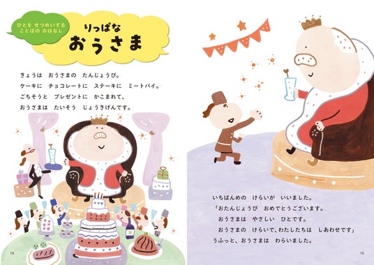 2話目の「りっぱな おうさま」は、人をあらわす〈形容詞・形容動詞〉のお話。王さまの誕生日会で、王さまをほめたたえる家来たちが出てきます。「やさしい人です」「しんせつな人です」ひとりずつ順番にほめたたえていきますが、途中からネタ切れして、雲行きがあやしくなってきます。「わがままな……ではなくて、しょうじきな人です」「だらしない……ではなくて、おおらかな人です」ぐっと手をにぎりしめる王さま。形容詞のおもしろさや豊かさにふれられるお話です。
