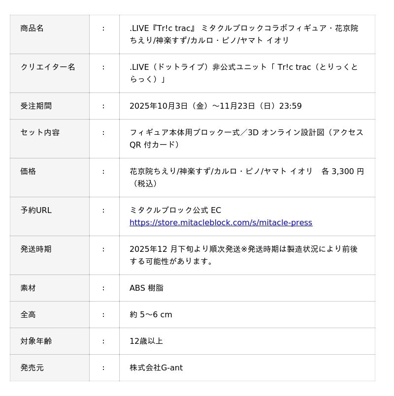 株式会社G-ant(所在地:東京都中央区、代表取締役:平川 彰悟)は、ボクセル技術を活用した組み立てフィギュア「ミタクルブロック」の最新ラインナップとして、株式会社アップランド(所在地:東京都世田谷区)が運営するVTuberプロダクション「.LIVE(どっとライブ)」非公式ユニット「Tr!c trac(とりっくとらっく)」(花京院ちえり、神楽すず、カルロ・ピノ、ヤマト イオリ)のメンバーとのコラボフィギュアの発売を開始いたします。本商品は2025年10月3日(金)20:00から11月23日(日)23:59までの期間限定で、ミタクルブロック公式オンラインストアにて受注生産で販売いたします。