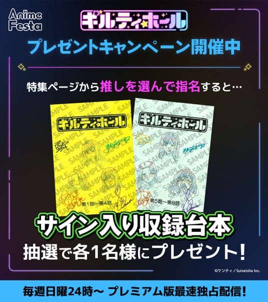 株式会社ウェイブ(本社:東京都豊島区、代表:関口航太)が運営するアニメ見放題サービス「AnimeFesta(アニメフェスタ)」は、2025年10月5日(日)24時00分より、秋アニメ『ギルティホール』に出演している声優陣のサイン入り収録台本が当たるプレゼントキャンペーンを開催します。