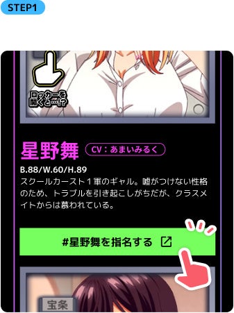 1.:特集ページ内のキャラクターから「指名する」ボタンを選択