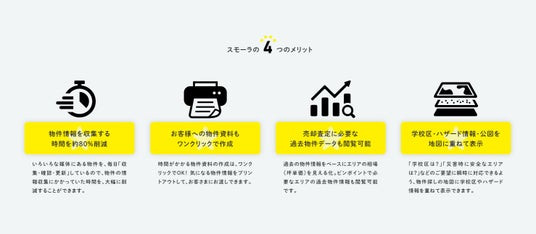 「スモ~ラ」は、自社で不動産仲介事業を行う会社だからこそ、現場で必要とされる機能だけを厳選し、使いやすさを追求した不動産地図情報サービスです。
