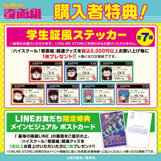 『ハイスクール!奇面組』POP UP STORE関連商品をご購入5,000円(税込)毎に1枚、学生証風ステッカーをプレゼント。