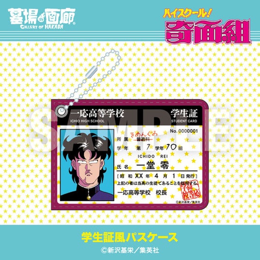 一応高校の学生証風パスケースが登場!パスケースの中には、奇面組リーダー一堂零の学生証が封入されたファン必携仕様!定期券やカードケースとしてはもちろん、紛失防止用のスマートタグ入れとして実用的なアイテムだ。