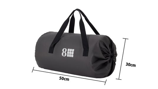 専用の防水オックスフォード生地収納袋付き。折りたたむと小型スーツケースほど(30×50cm)のサイズになり、小さく持ち運びやすい設計です。