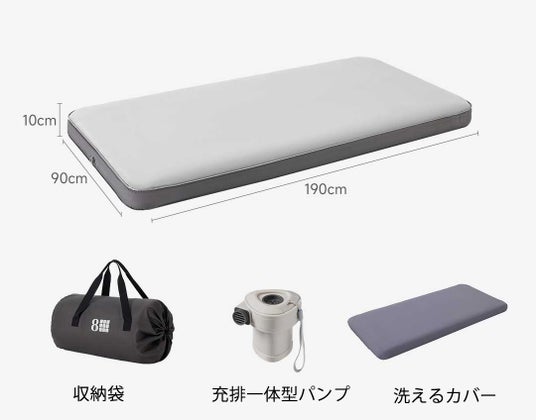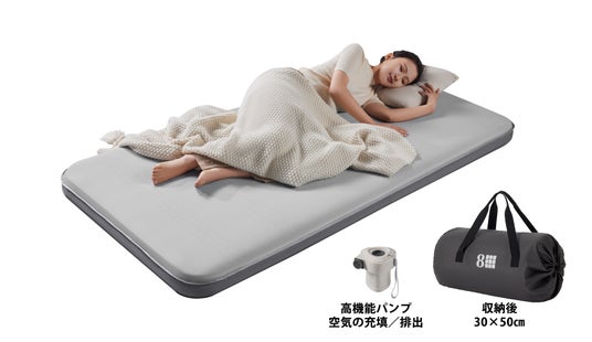 キャンプやアウトドア、急な来客、災害時の避難所など、さまざまなシーンで活躍するマットレスです。電動ポンプ付きで、わずか数分でふかふかの寝床が完成。使わないときはコンパクトに折りたたんで収納できるので、置き場所にも困りません。