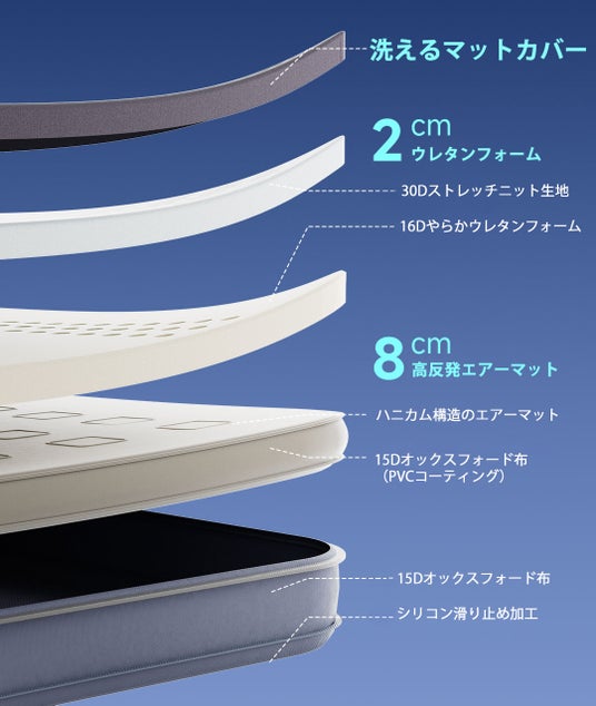 厚さ8cmの高反発エアーマットの上に2cmのウレタンフォームを重ねることで、優れたクッション性とやわらかな肌触りを実現。
