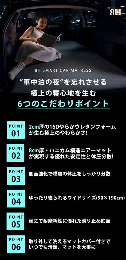 その想いから生まれたのが、まるで五つ星ホテルのベッドをそのまま車内に運び込んだような快適さと、使いやすさを両立した「8H車載多機能スマートマットレス」です。