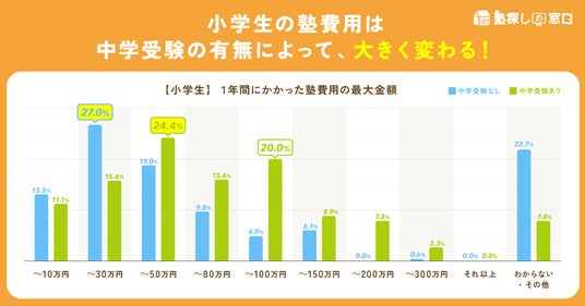 一方で、中学受験をさせた(予定を含む)家庭での最多回答は、年間支出50万円まで、というものです。そして、100万円以上までという回答が続きます。ここが、注目したいポイントです。中学受験していない(予定がない)家庭と比べて、中学受験をさせた(予定を含む)家庭は、年間100万円以上を塾に支払うケースが多いとわかります。
