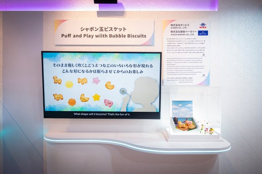 シャボン玉で遊び親子のコミュニケーションを図ることも意識した「シャボン玉ビスケット」リアル展示の様子