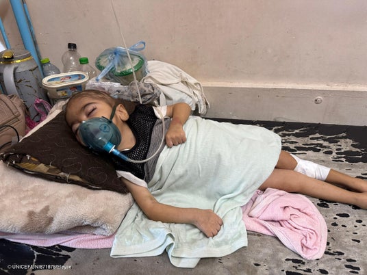 ガザ市の避難民キャンプで、友達と遊んでいた時に近くで爆撃があり、その破片でけがを負った6歳のマリアムさん。頭蓋骨を骨折し、脳に血腫ができた娘を見て、父親は「私たちが逃げられる場所はもう空しかない」と話す(パレスチナ、2025年9月16日撮影) (C) UNICEF/UNI865578/Nateel