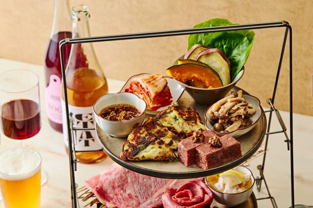 ティースタンドの上段には、旬の秋野菜を使ったチーズチヂミや彩りナムル、濃厚な和牛テリーヌ。下段には、肉ブーケ仕立ての上タン塩をはじめ、柚子胡椒リブロースステーキやホルモン・ハラミ・ロース・などのお肉が並びます。