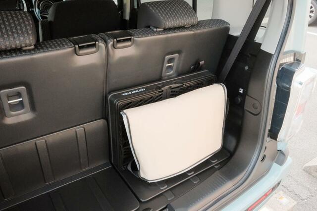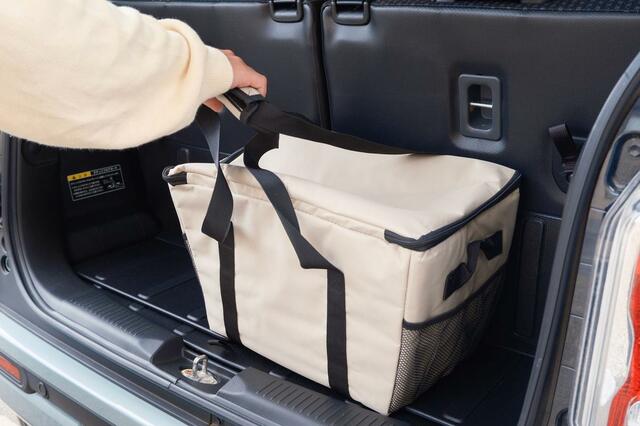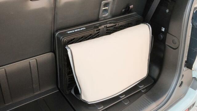 カゴも保冷バッグもコンパクトになるから、トランクルームにはこのように積んでいます。