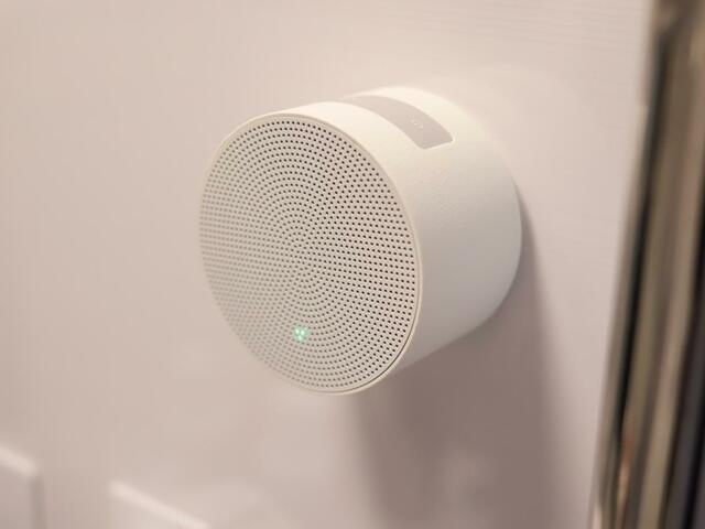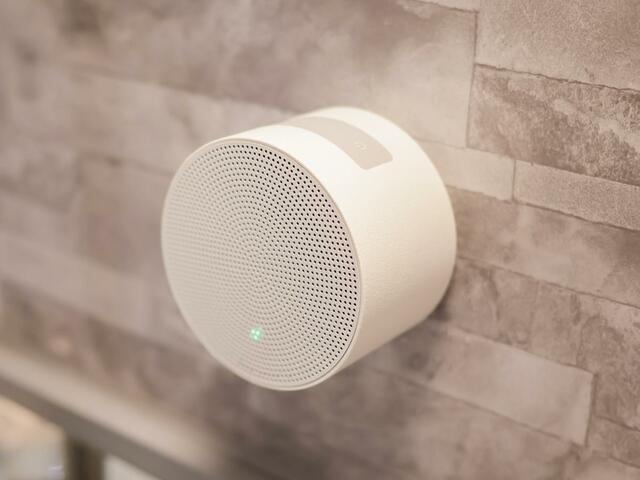 「よりバスタイムを充実させたい!」と考えて導入した、水場で使うためのスピーカーは、壁にペタッとするだけでOK。