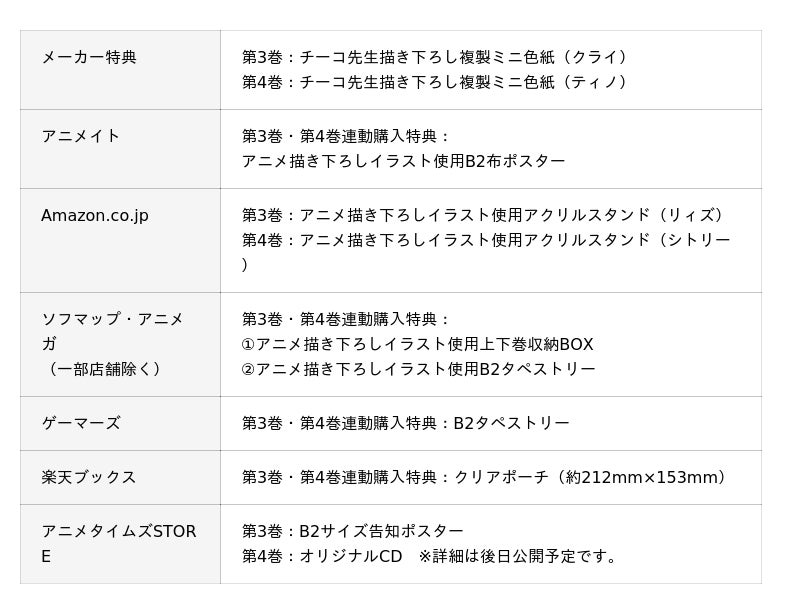 さらにメーカー特典として、第3巻に「チーコ先生描き下ろし複製ミニ色紙(クライ)」、第4巻に「チーコ先生描き下ろし複製ミニ色紙(ティノ)」が登場。また、Blu-ray第3巻を対象店舗にて期間中にご予約いただいた方に、早期予約特典「RPG風ダイカットステッカー(クライ&ティノ)」も付いてくる!その他、各種法人別特典などの詳細は公式HP(https://nageki-anime.com/#top)をご確認ください。
