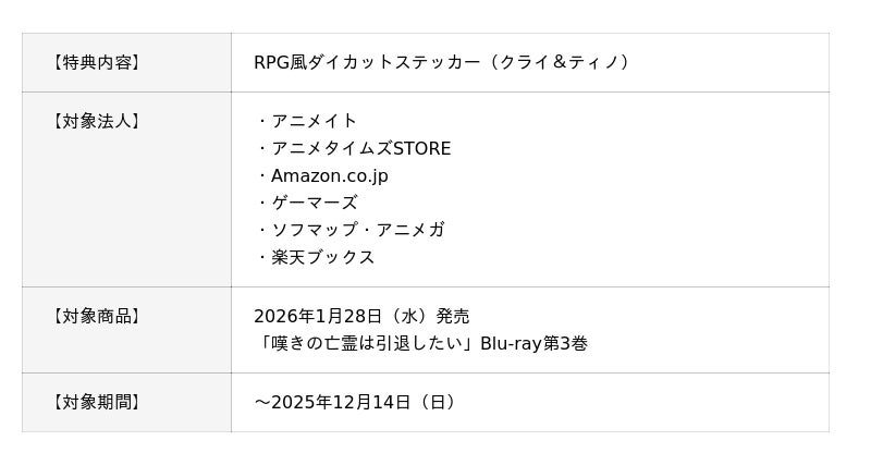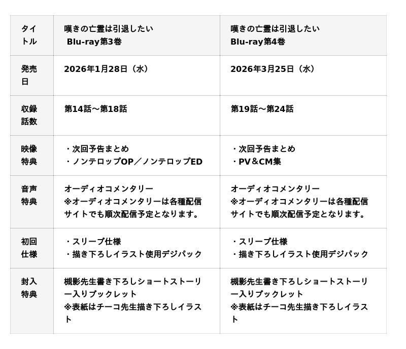TVアニメ『嘆きの亡霊は引退したい』第2クールのBlu-rayシリーズ第3巻と第4巻の発売が決定!第3巻は2026年1月28日(水)、第4巻は2026年3月25日(水)の発売を予定です。なお、封入特典やメーカー特典、早期予約特典も公開されています。