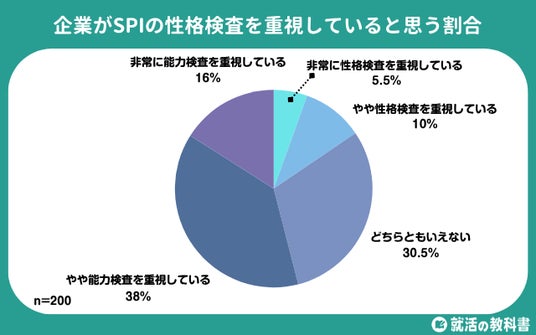 企業がSPIの性格検査を重視しているかについて、「非常に性格検査を重視している」(5.5%)、「やや性格検査を重視している」(10.0%)と答えた就活生はあわせて15.5%でした。