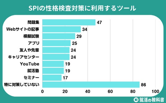 SPIの性格検査対策に利用するツールは「問題集」(47人)が最も多くなりました。