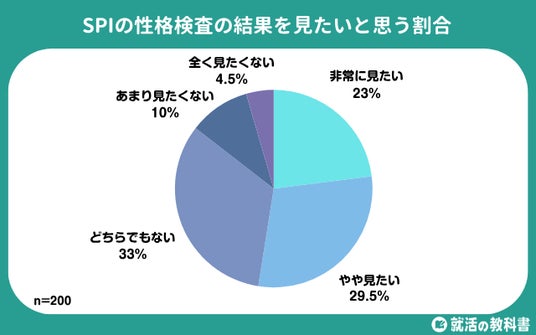 SPIの性格検査の結果について、「非常に見たい」(23.0%)、「やや見たい」(29.5%)と答えた就活生は合計52.5%でした。半数の就活生が性格検査の結果を「自己理解のツール」として活用したいと考えていることがわかりました。