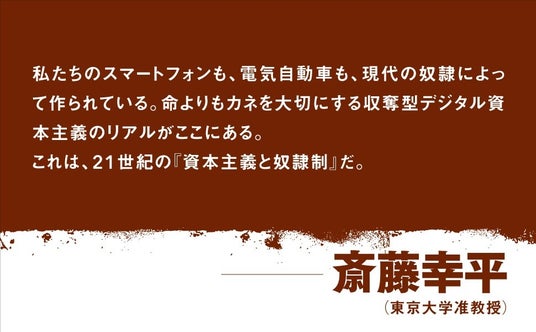 「私たちのスマートフォンも、電気自動車も、現代の奴隷によって作られている。命よりもカネを大切にする収奪型デジタル資本主義のリアルがここにある。これは、21世紀の『資本主義と奴隷制』だ。」
