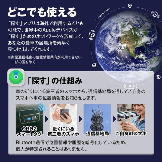 OBD2トラッカーの位置情報の確認は、「探す」アプリを使用すれば海外からでも確認ができます。世界中のAppleデバイスが「探す」のネットワークを形成してあなたの愛車を素早く発見します。