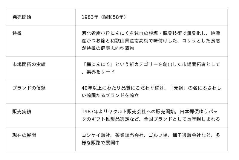 発売当初は認知に時間を要しましたが、試食品の提供や個人代理店との連携など、地道な努力を重ねた結果、1987年にはヤクルト販売会社への本格販売を開始し、全国ブランドへと成長。現在では、競合他社からも類似商品が多数発売され、「梅にんにく」という一大市場を築き上げた先駆者としての地位を確立いたしました。