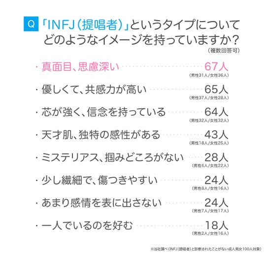 続いては、「INFJ(提唱者)と診断されたことがない成人男女100人」を対象に、INFJ(提唱者)に対するイメージを尋ねました。