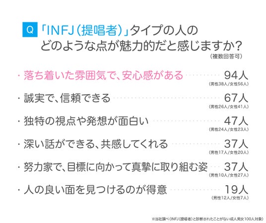 続いて、「INFJ(提唱者)と診断されたことがない成人男女100人」を対象に、INFJ(提唱者)のどのような点に魅力を感じるか尋ねました。