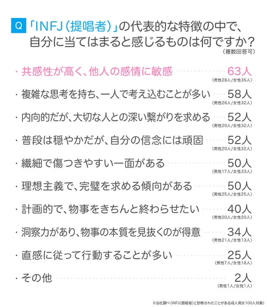 ここからは、より詳しくINFJ(提唱者)について調査するために、先ほどのアンケートとは別に、「INFJ(提唱者)と診断された経験のある成人男女100人」を対象に実施したアンケート結果を紹介します。
