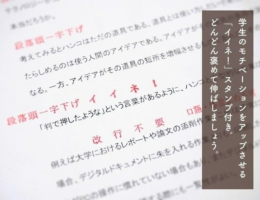 「説明不足」や「論理の飛躍」「単なる感想」「一文が長い」「イイネ!」など、添削でよく使われる14種類の文言で構成。先生の膨大な添削作業の手間を省きながら、学生の”伝わる文章表現”の上達を促します