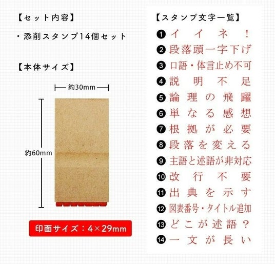 「説明不足」「論理の飛躍」「単なる感想」「出典を示す」「一文が長い」など、添削で頻出するコメントを14種類のスタンプにまとめました。