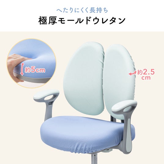 極厚モールドウレタンの座面はふかふかで耐久性にも優れ、長時間座ってもへたりにくい仕様です。学習や在宅ワークなど、日常のあらゆるシーンで快適な座り心地を提供し、集中力と効率を高めます。