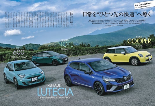 ミニクーパー、日産ノートオーラ、フィアット600HVという、日欧のパワートレーンの違うコンパクトカーたちとの比較試乗。異なる個性を見せるクルマたちの中で、ルーテシアはどんな表情を見せるのか?