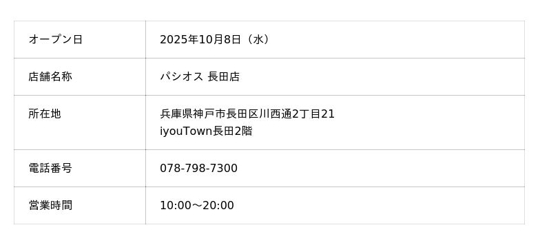 株式会社田原屋(本社所在地:神奈川県川崎市、代表取締役会長:田熊 太郎、代表取締役社長:甲斐 直裕)は、2025年10月8日(水)兵庫県神戸市長田区の商業施設「iyouTown(アイユータウン) 長田」内に、「パシオス 長田店」をオープンいたします。本店舗は、当社にとって神戸市2店舗目の出店となります。