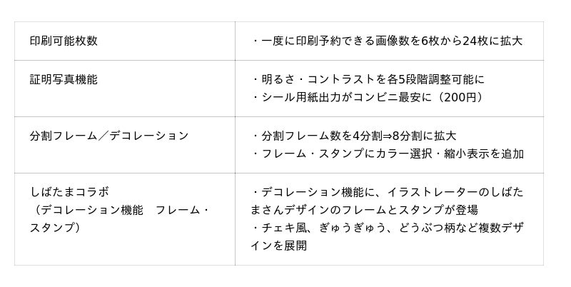 このたび、お客さまから寄せられた「写真を手軽にデザインしたい」「証明写真を安く印刷したい」「フレームやスタンプの種類を増やしてほしい」といった声を反映し、利便性・機能性・楽しさの3つの観点でアップデートいたしました。