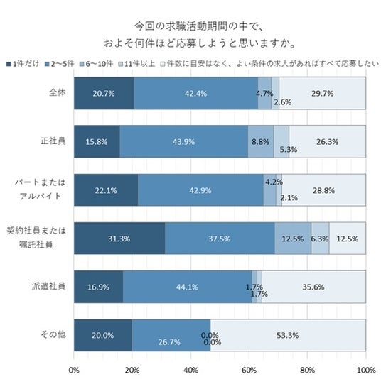 「2~5件」42.4%、「件数に目安はなく、よい条件があればすべて応募したい」29.7%、「1件だけ」20.7%