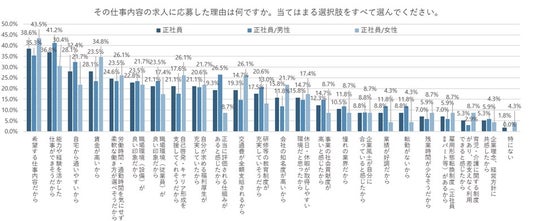 求人に応募した、正社員雇用を希望する人に、自身が応募した求人を選んだ理由をきいた(複数回答)。多かったのは「希望する仕事内容だから」が38.6%、 「能力や経験を活かした仕事ができそうだから」が36.8%、 「自宅から通いやすいから」 が28.1%となった。